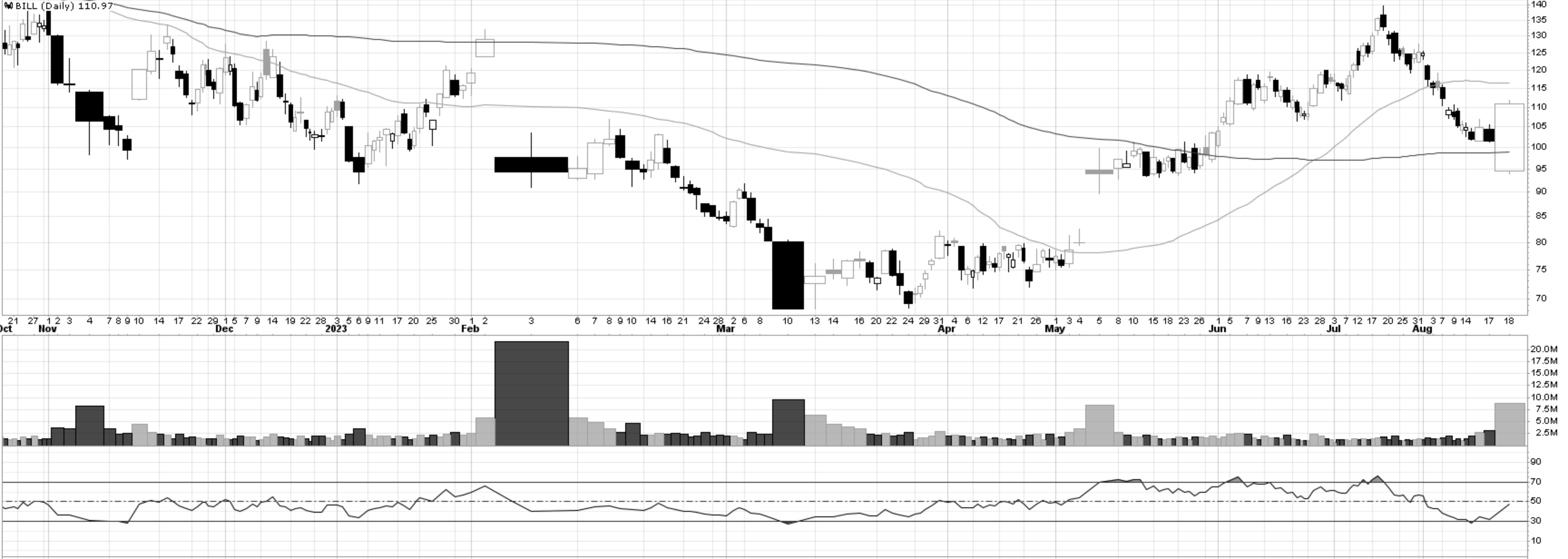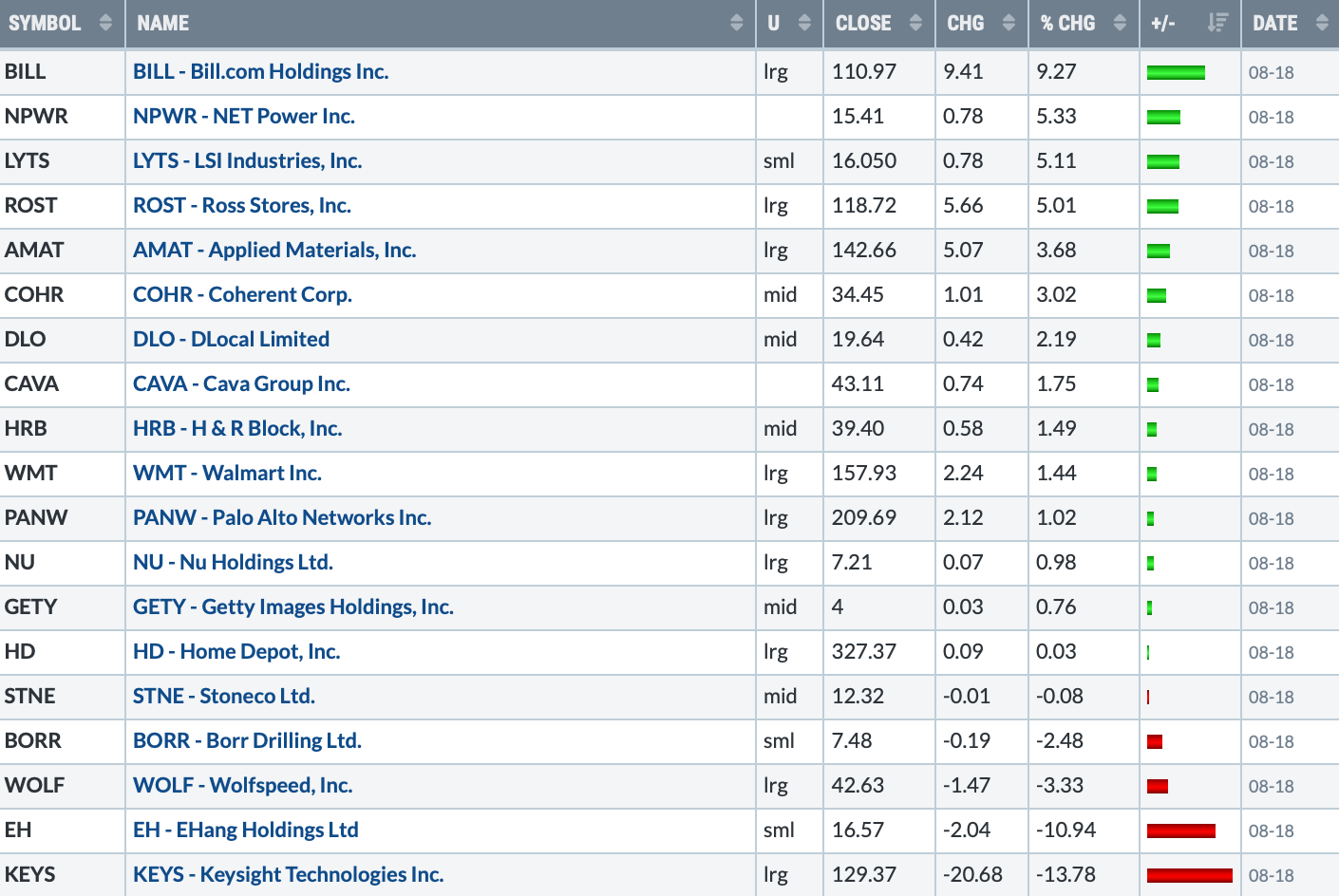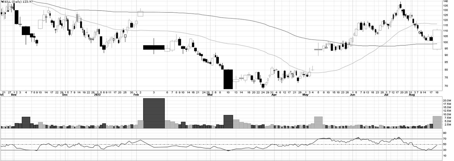 Speaking of ownership, Friday saw a lot of shares changing hands in Bill.com, a service for small businesses. Prior to earnings, the fortunes of BILL 0.00%↑ have followed the decline in small-caps to a tee. Friday however was potentially the type of volume to propel the stock higher over the long-term. With such a large daily move it’s unlikely that the price will continue an immediate explosion. However this relative performance now projects the stock onto the high-quality list for an early correction when conditions improve across the whole market.
