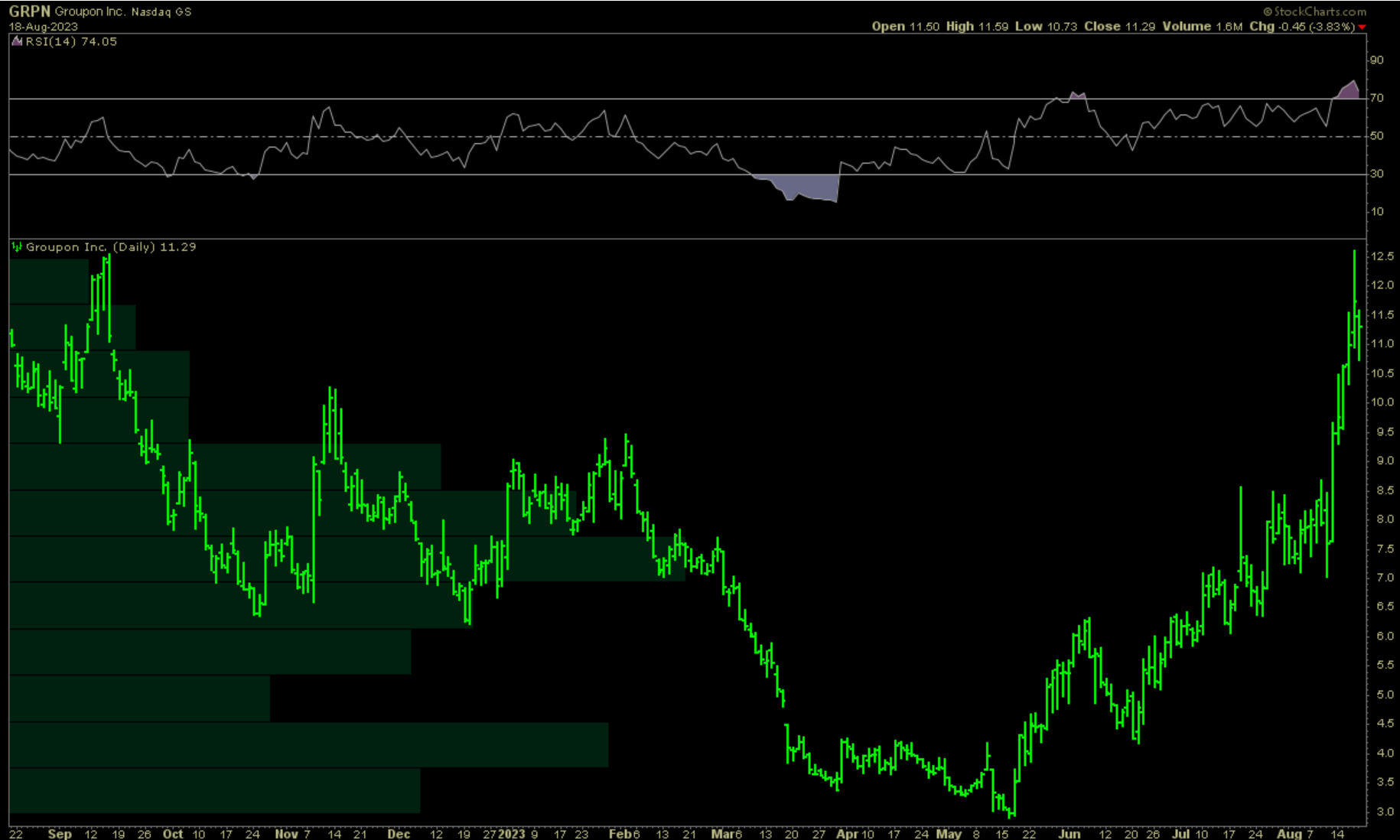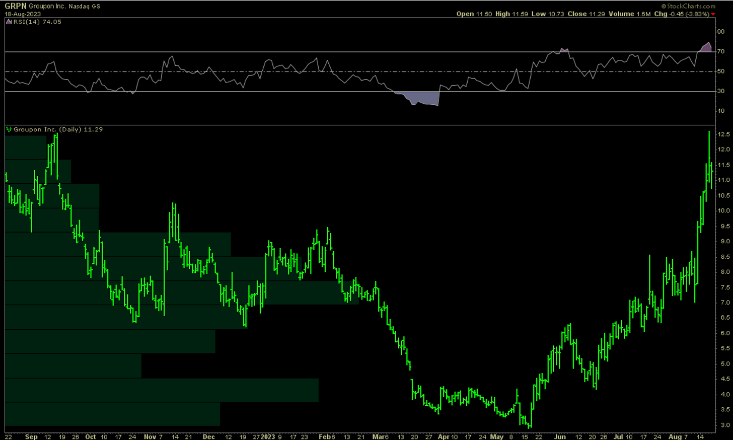 Another name drawing interest is Groupon, yes that Groupon(!). The historical fundamentals don’t look great. GPN 0.00%↑ isn’t currently profitable. It may also need to raise cash, but the company beat expectations in their previous quarterly update, and their statements point to some signs of good stewardship from management. We notice large interest in owning these shares recently. Here is the daily chart.
