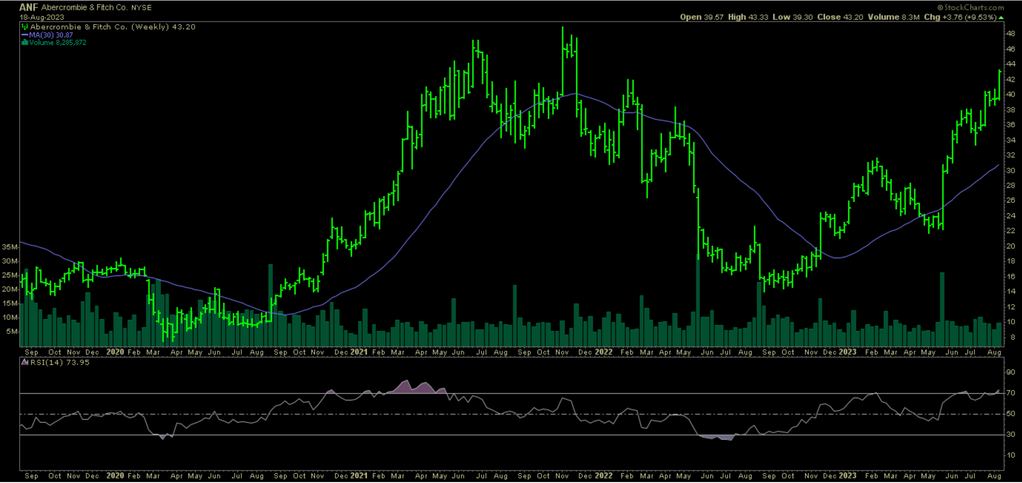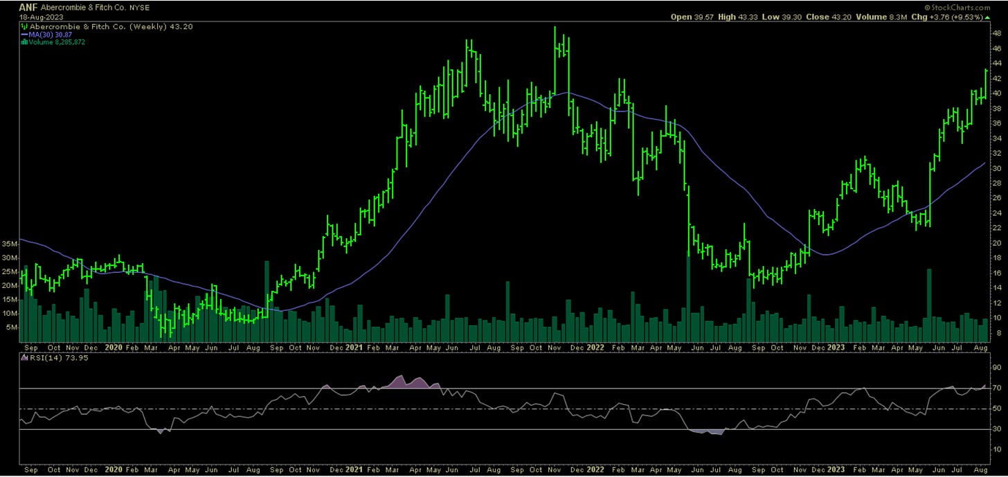 Looking across the NYSE and Nasdaq, of stocks with improving fundamentals, there are only 3x names making a mark. Those companies are ANF 0.00%↑ , ROST 0.00%↑ , and PDCO 0.00%↑ . Last week Ross reported good results. Wall Street is expecting similar from Abercrombie & Finch. As you can see, looking at the weekly chart below, this stock has been on a tear. ANF 0.00%↑ reports earnings before the bell on Wednesday. Weekly options are currently pricing in a 7% move.