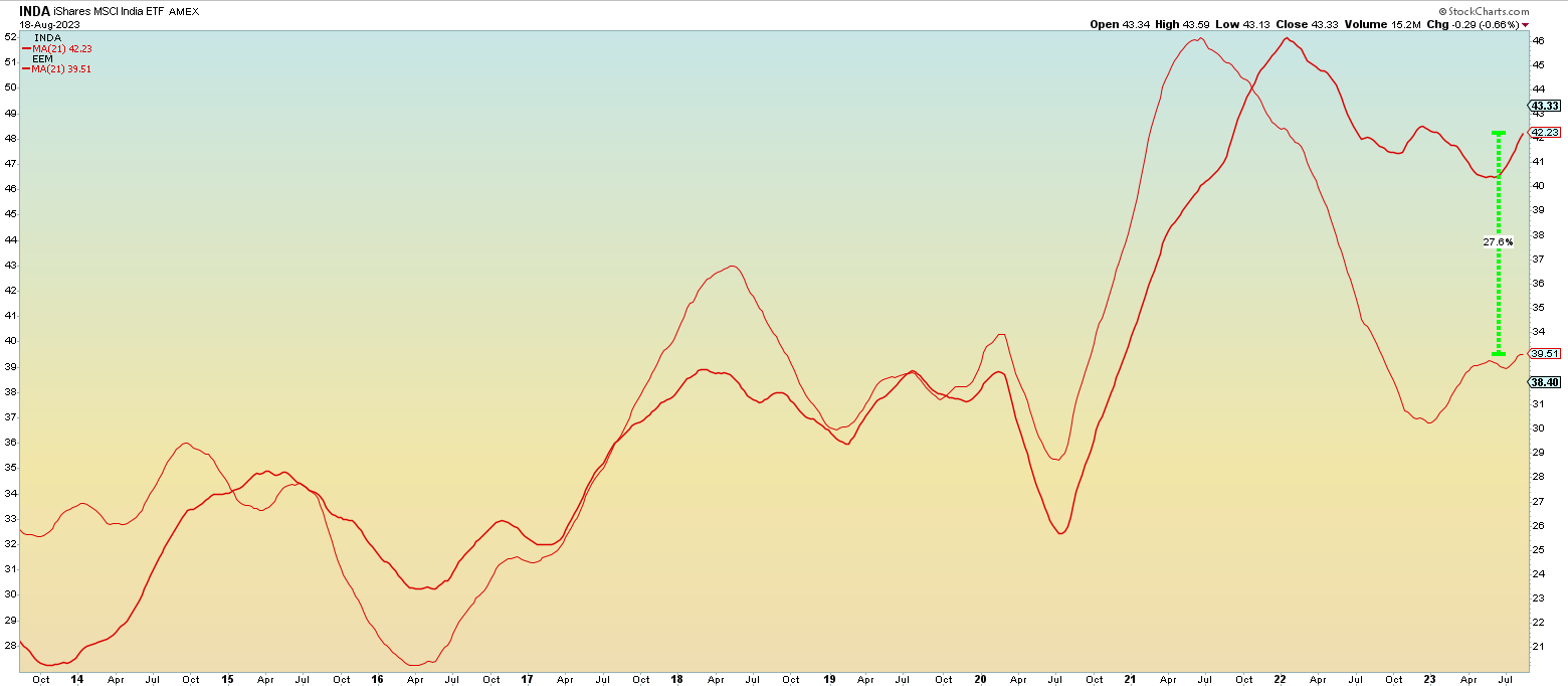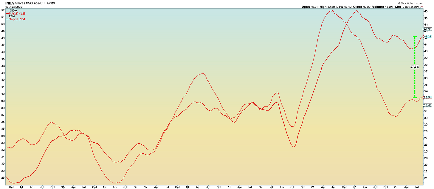 Over the last 18 months, iShares’ etf that tracks Indian large cap dividend paying corporations is displaying significant outperformance vs. it E.M. peers - see chart below plotting the weekly moving averages of INDA 0.00%↑ and EEM 0.00%↑ .