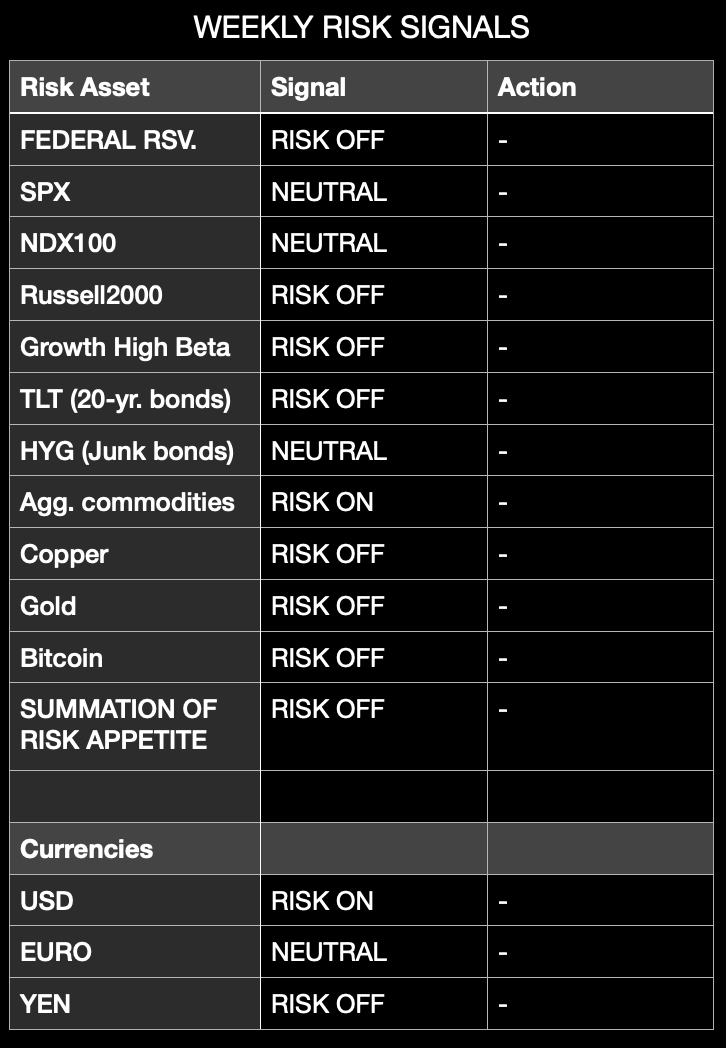 Weekly risk signals are based on intermediate and long-term market trends, as well as the flow of money into or away from asset classes. Not included are potential fundamental or gamma implied volatility tail risks.