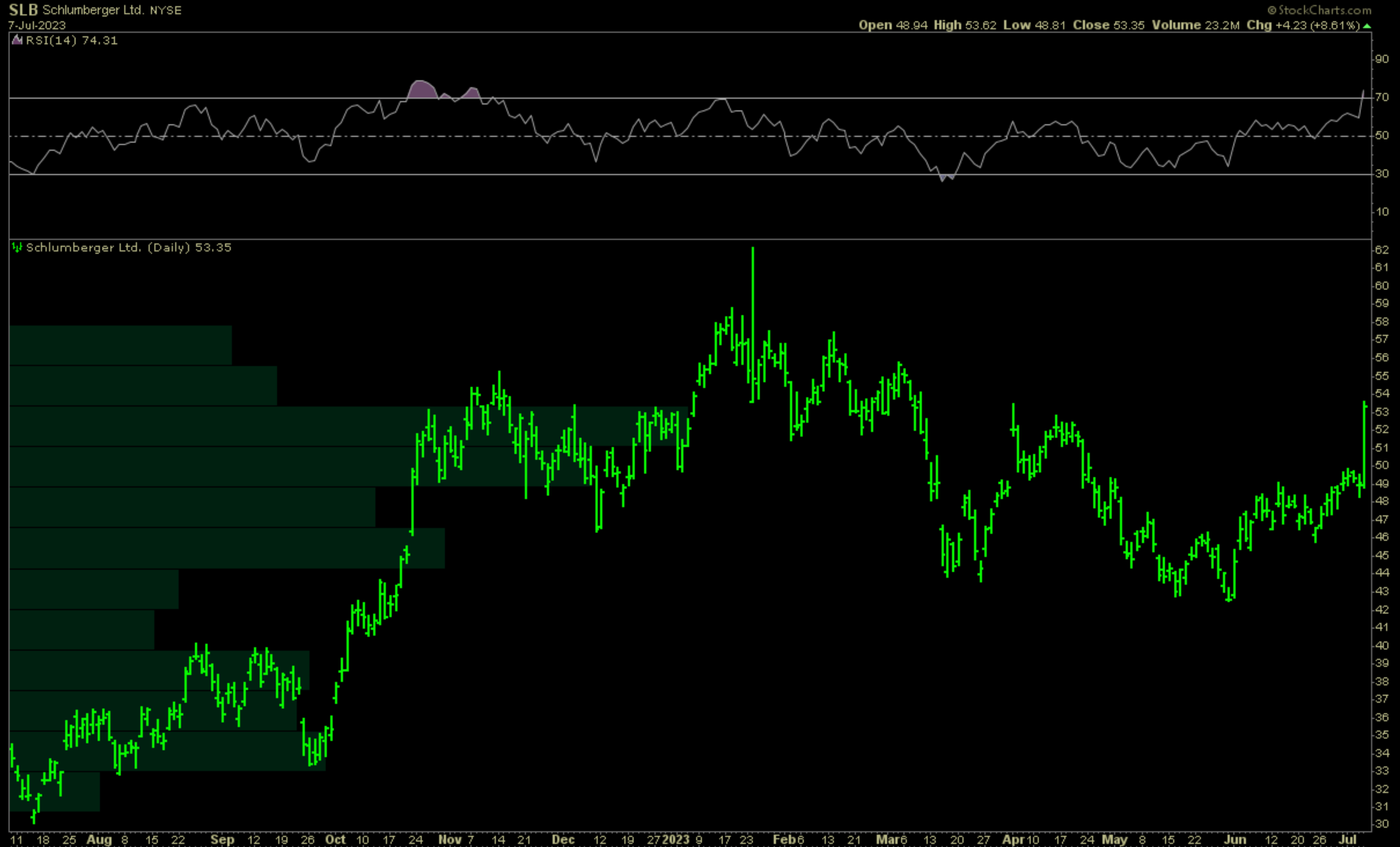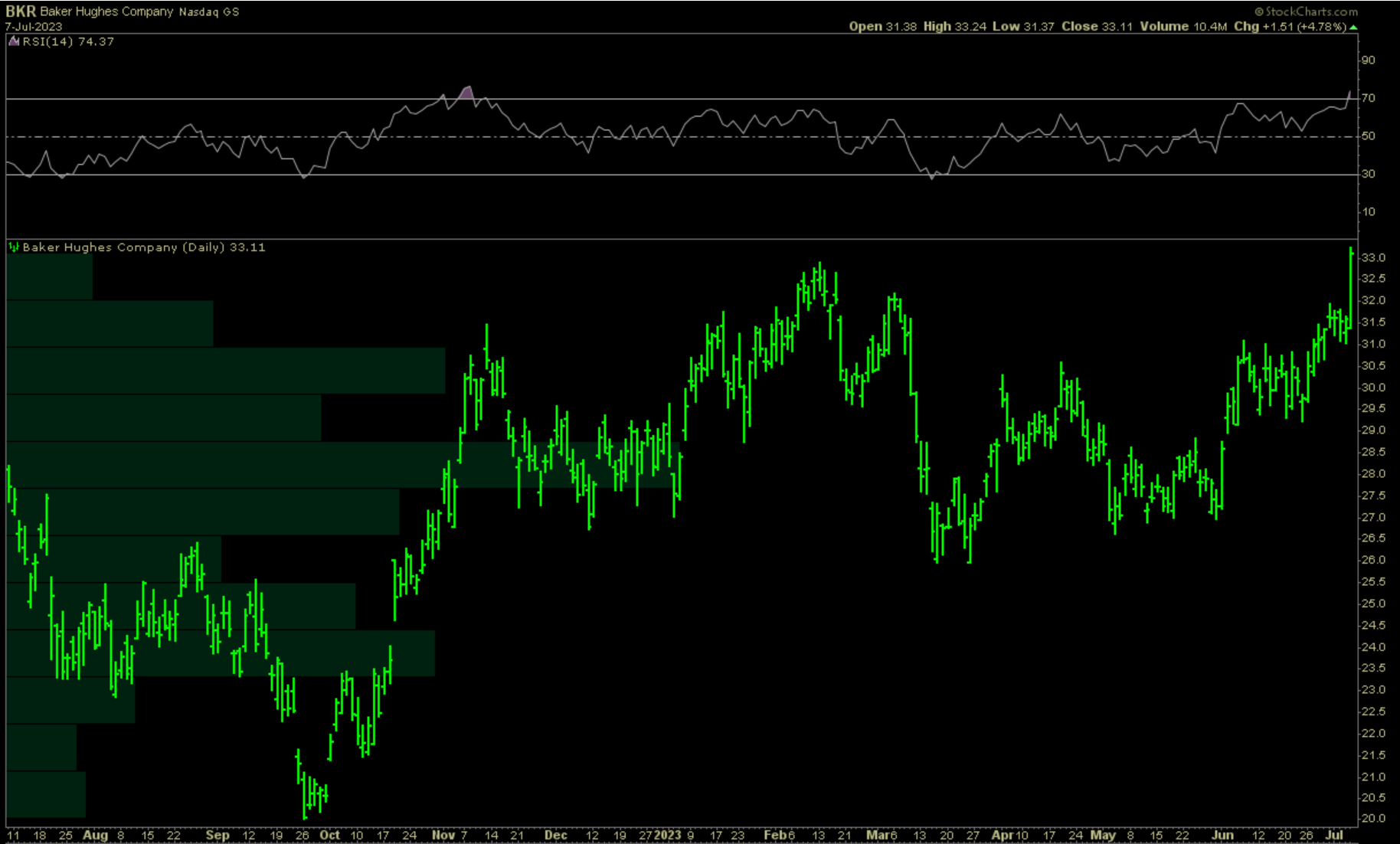 Gaining investor’s attention Friday were oil services appearing to breakout and closing at the top of their daily range on heavy buying volume. Since they are pretty much the same chart, we’re watching the outlooks for both BKR 0.00%↑ and SLB 0.00%↑ below.