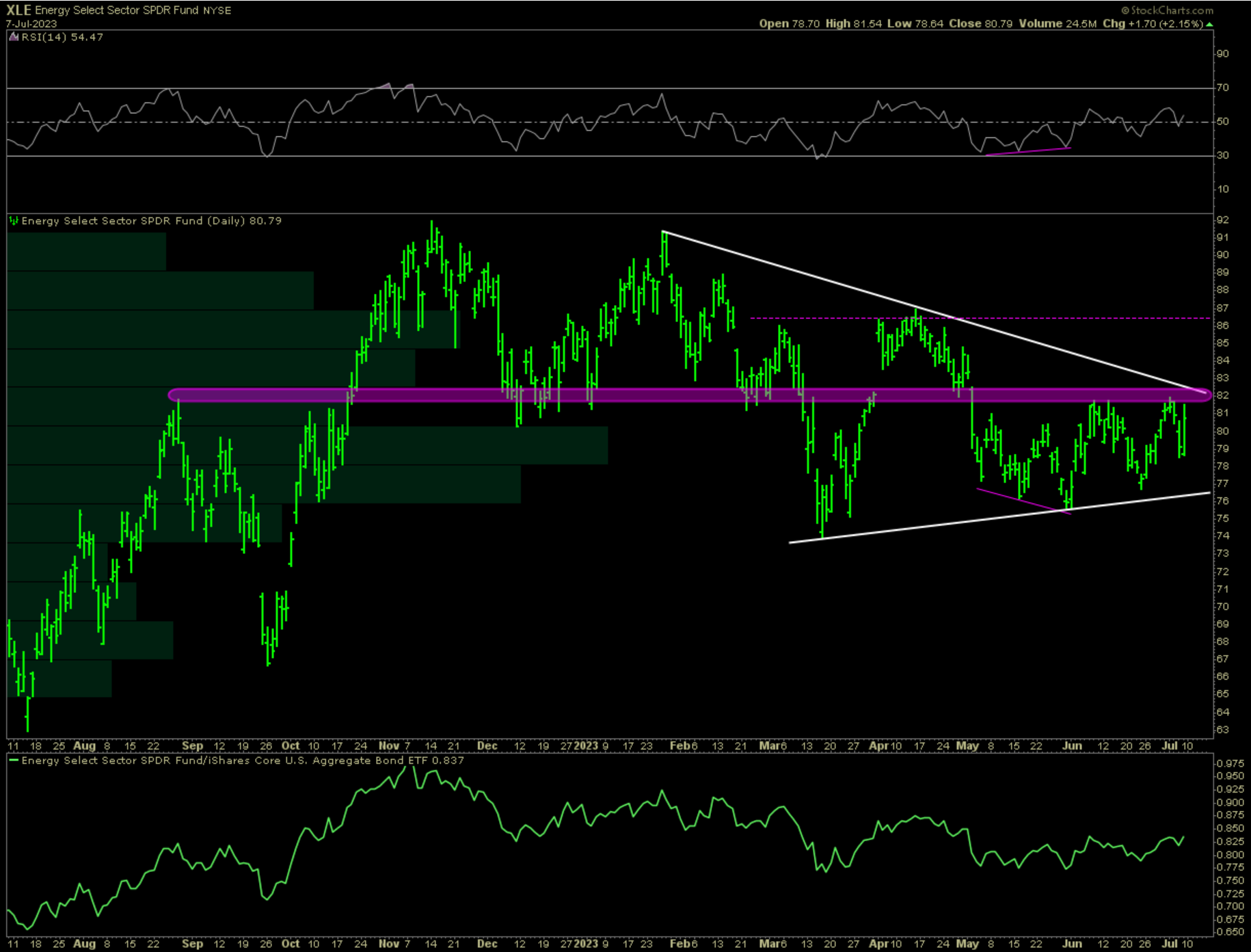 Because of the July 4th holiday there were no inventories data from US energy agencies so we can’t confirm that we want to get bullish on this sector prior to price confirming a breakout. As seen from the chart above, there is a lot of overhead baggage, so we first want to see a break above the downtrending line before we get excited.