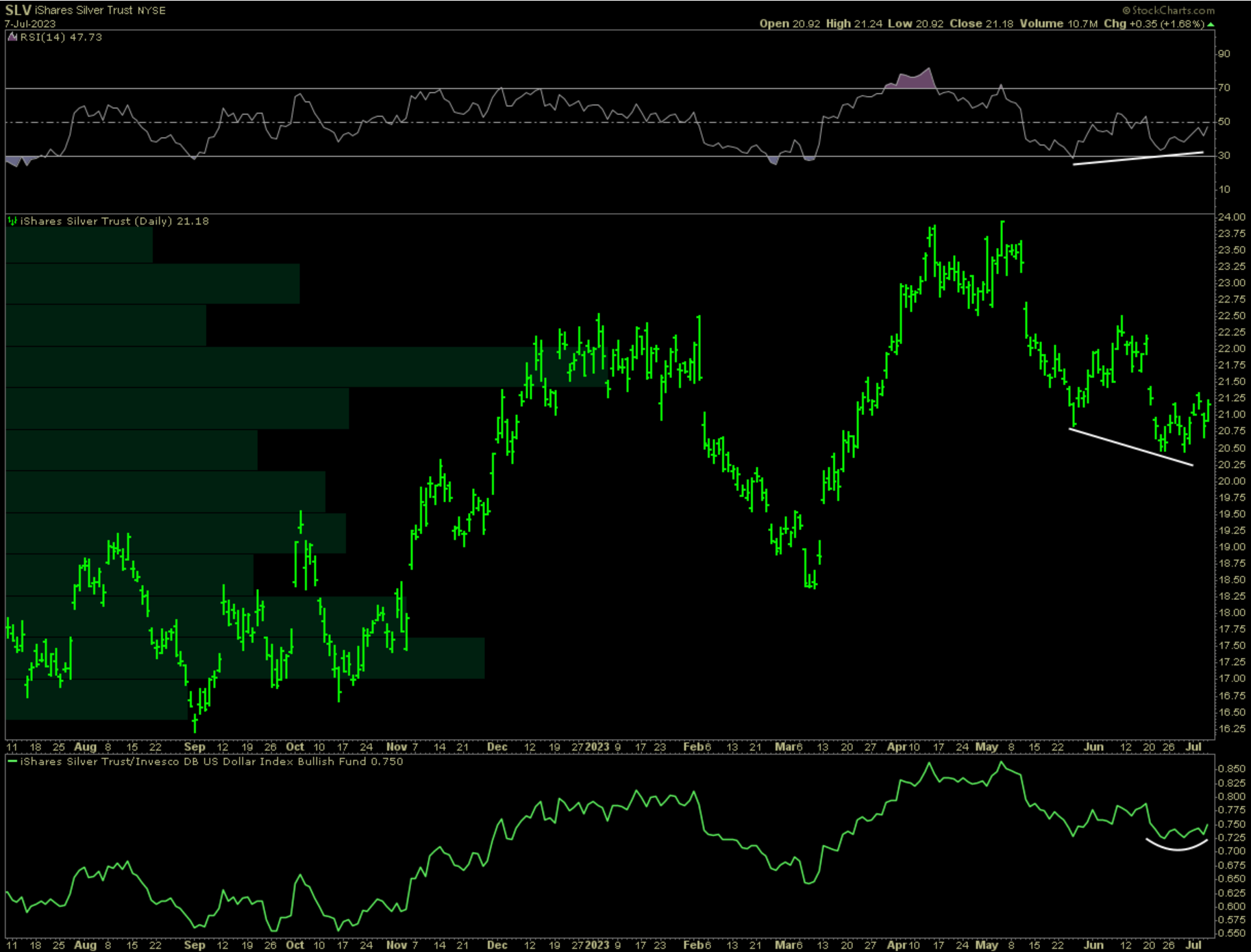 With hard assets like real estate outperforming on the week, and oil basing in the commodities space, there may be some opportunity in precious metals, here taking a look at a possible positive divergence in the chart of SLV 0.00%↑