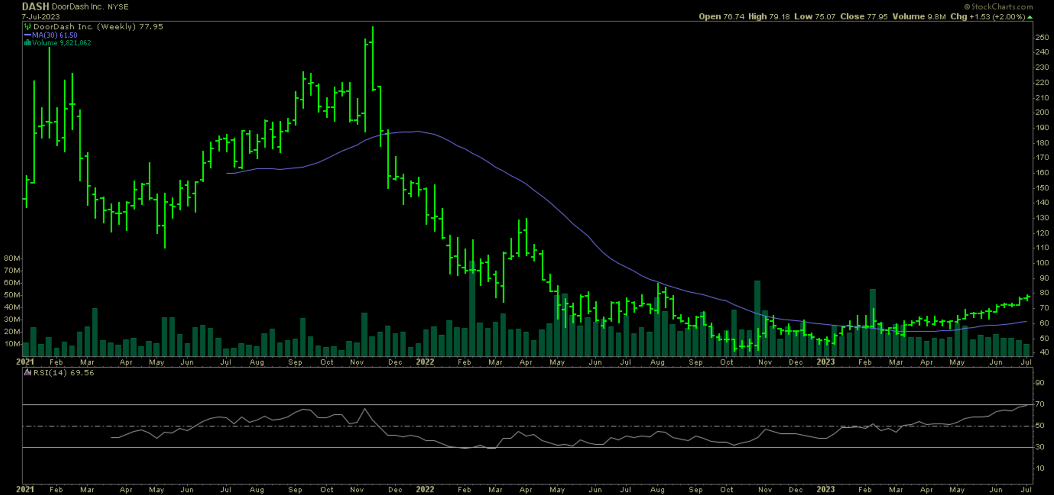 Flying in the face of rotation into value stocks and beaten down internet companies, lastly we take a look at the run DoorDash has been having. With a weekly rsi getting overbought, it’s also worth watching if/when the move stalls out and mean reversion takes hold.