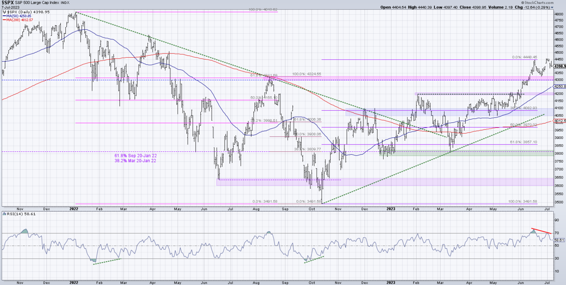 It’s not so often we bring up the chart of the S&P500, as it is assumed most market participants have it as a part of their morning coffee routine to study it for the pulse of the markets. However bringing in David Keller’s chart from the Mindful Investor, we see clearly distribution at the 4400 level with negative rsi divergence showing up. Now for technicians it was hugely important when we crossed the 62% fibonacci retracement of the all-time highs at 4300, as such moves generally confirm the entrance of a new bull market. In my mind it’s not so important if bulls show up again at 4300, but their are both rising trendlines and moving averages below to be aware of. Therefore, possible tests in the forthcoming weeks and/or months to come bear significant importance.