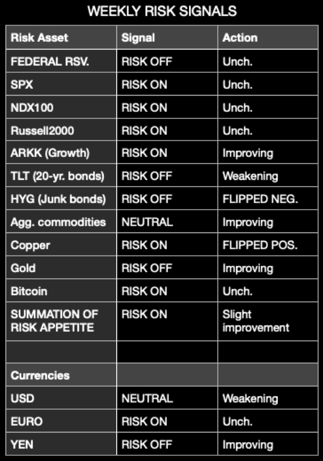Weekly risk signals are based on intermediate and long-term market trends, as well as the flow of money into or away from asset classes. Not included are potential fundamental or gamma implied volatility tail risks.